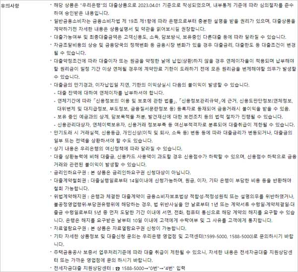 기타 자세한 상품정보 및 대출신청 문의는 영업점 직원 또는 우리은행 고객센터(1599-5000 또는 1588-5000)에 문의하거나 우리은행 홈페이지를 참조하면 된다고 합니다.