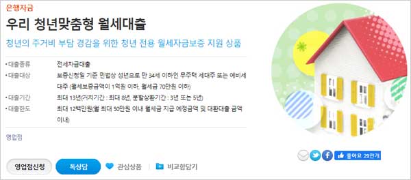 ▶ 우리은행 청년맞춤형 월세대출 금리 이자 이율 및 대출 유의사항 등 우리은행 청년맞춤형 월세대출 상품에 대한 홈페이지 내용은 다음과 같은데요. 참고하셨으면 좋겠습니다.