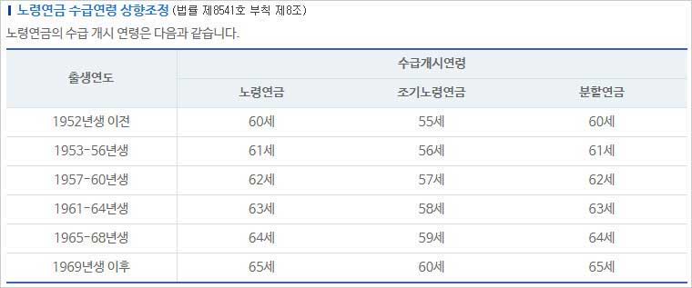 즉 2012년(1952년생 이전)까지만 해도 만 60세에 노령연금을 받았다고 합니다. 하지만 2013년(1953년생부터)부터 만 61세로 늦춰졌다고 합니다. 또한 2018년(1957년생부터)부터는 만 62세로 수급연령이 늦춰졌으며 1969년 이후 출생자의 연금수급개시 연령이 만 65세로 늦춰지게 됐다고 합니다.