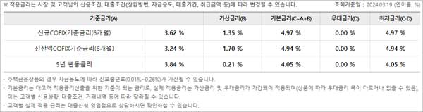 - 다음과 같은데요. 2024년 3월 19일 기준금리 및 변동금리에 대한 가산금리, 기준금리, 우대금리, 최저금리라고 합니다.