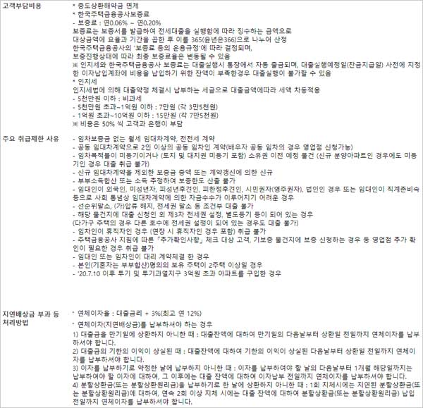 다만 규제지역(투기 및 투기과열지구) 3억원 초과 아파트 2020년.7.10 이후 구입자는 취급이 불가하구요. 2주택 이상 보유자 또한 취급 불가라고 해요. 임대차계약사실확인서 징구 생략 불가 대상자의 경우 취급 불가(주택금융공사 내부 CSS 7~9등급 해당)라고 하는데요. 개인신용평점 및 심사기준에 따라 대출이 제한될 수 있다고 해요.