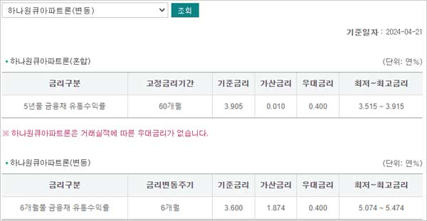 ▶ 하나은행 아파트 담보대출 금리 이자 이율은 다음과 같은데요. 2024.04.21일 현재, 대출기간 2년, 주택구입자금용도, 비거치식 분할상환방식, 하나은행 내부 신용등급 3등급인 고객에게 적용하는 금리라고 해요.