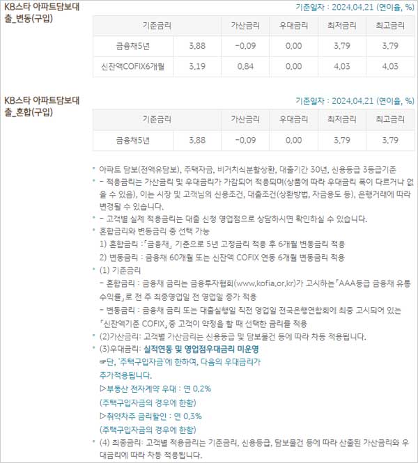 ▶ 국민은행 아파트 담보대출 금리 이자 이율은 다음과 같은데요. 2024.04.21일 현재, 아파트 담보(전액유담보), 주택자금, 비거치식분할상환, 대출기간 30년, 신용등급 3등급 기준 적용금리라고 해요.