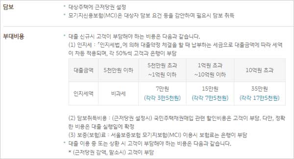 - 보증(보험)료: 서울보증보험 모기지보험(MCI) 이용시 보험료는 은행이 부담하구요