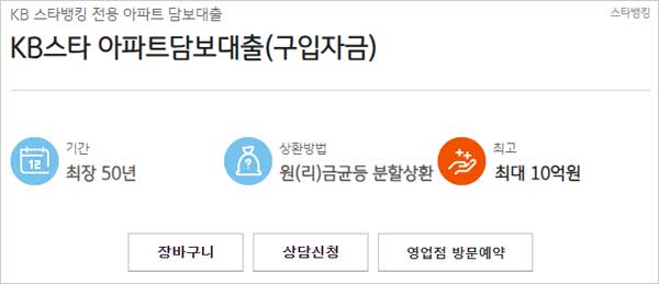 KB스타뱅킹 전용 아파트 담보대출 상품인 kb국민은행 아파트 담보대출 상품의 대출 한도 금액은 최대 10억원 이내이며 대출상환방식은 원금균등 분할상환 또는 원리금균등 분할상환 방식이라고 하구요. 대출기간은 최저 10년 이상 최장 50년 이내라고 해요.
