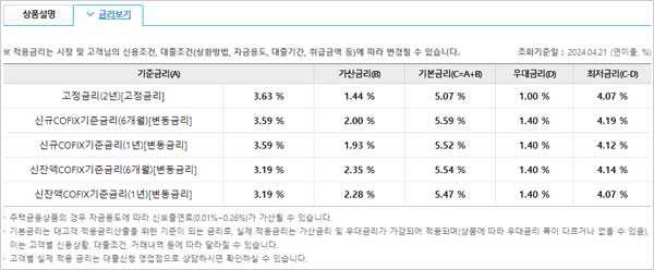 다만 기본금리는 대고객 적용금리산출을 위한 기준이 되는 금리로, 실제 적용금리는 가산금리 및 우대금리가 가감되어 적용되며(상품에 따라 우대금리 폭이 다르거나 없을 수 있음) 고객별 신용상황, 대출조건, 거래내역 등에 따라 달라질 수 있E다고 해요.