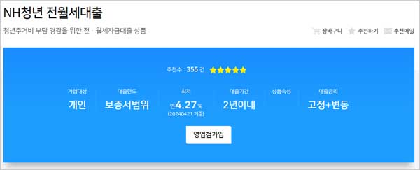 농협 청년 전세보증금 담보대출 상품은 만 34세 이하 무주택 청년을 대상으로 저리의 임차자금을 지원하는 대출 상품으로서 주택금융신용보증서 담보로 대출 한도 임차 보증금의 90% 이내에서 최대 2억원이라고 하구요. 대출기간은 임차기간 중 2년 이내라고 해요.