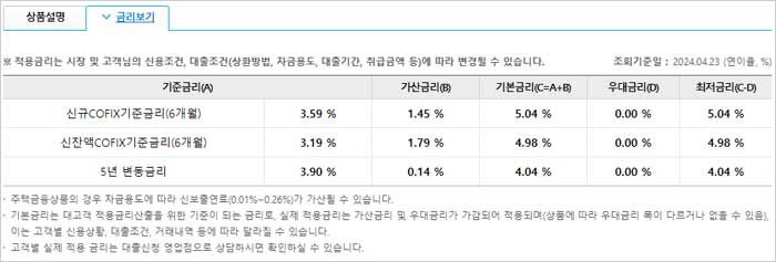 ▶ 우리은행 주택담보대출 금리 비교 이자 이율은 다음과 같은데요. 2024년 4월 23일 기준금리 및 변동금리에 대한 가산금리, 기준금리, 우대금리, 최저금리라고 해요.