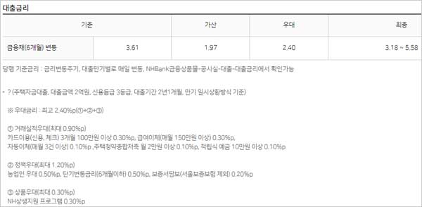 기준금리는 금리변동주기, 대출만기별로 매일 변동되며 NHBank금융상품몰-공시실-대출-대출금리에서 확인 가능한데요. 다만 실제 적용금리는 기준금리에 고객 신용등급, 대출조건, 거래실적 등에 따라 차등 적용되어 최종 결정되기 때문에 금리 관련 자세한 사항은 영업점 직원과 상담이 필요하다고 해요.