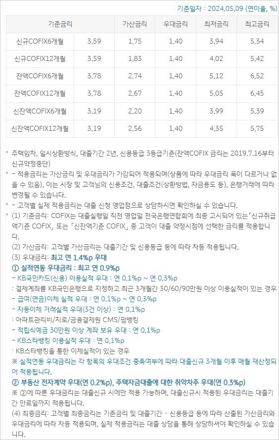 ▶금리 이자 이율은 다음과 같은데요. 2024.05.09일 현재, 주택임차, 일시상환방식,대출기간 2년, 신용등급 3등급인 고객에게 적용하는 금리라고 해요.