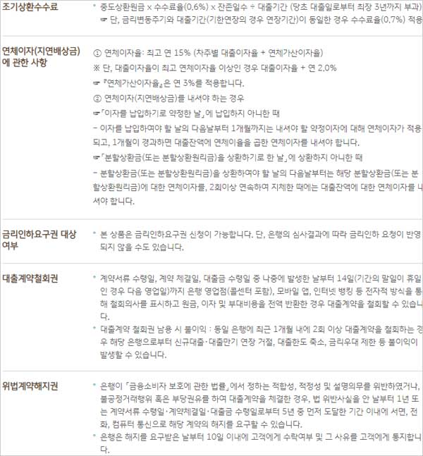 ▶ 중도상환수수료 조기상환수수료는 중도상환원금 x 수수료율(0.6%) x 잔존일수 ÷ 대출기간 (당초 대출일로부터 최장 3년까지 부과)이라고 하는데요. 다만 금리변동주기와 대출기간(기한연장의 경우 연장기간)이 동일한 경우 수수료율(0.7%)이 적용된다고 해요.