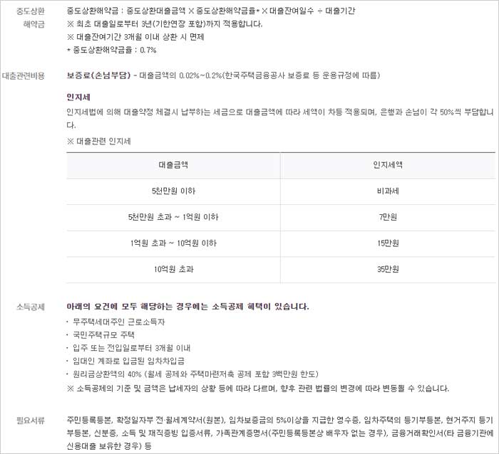 ▶ 중도상환수수료 해약금은 중도상환대출금액 X 중도상환해약금율(0.7%) X 대출잔여일수 ÷ 대출기간이라고 하구요. ▶ 대출 관련 비용은 대출금액의 0.02%~0.2%(한국주택금융공사 보증료 등 운용규정에 따름) 보증료가 있구요. 각 50%씩 부담하는 인지세가 있다고 해요.