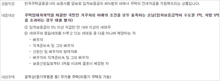 - 주민등록등본, 확정일자부 전·월세계약서(원본), 임차보증금의 5%이상을 지급한 영수증, 임차주택의 등기부등본, 현거주지 등기부등본, 신분증, 소득 및 재직증빙 입증서류, 가족관계증명서(주민등록등본상 배우자 없는 경우), 금융거래확인서(타 금융기관에 신용대출 보유한 경우) 등이 있으며