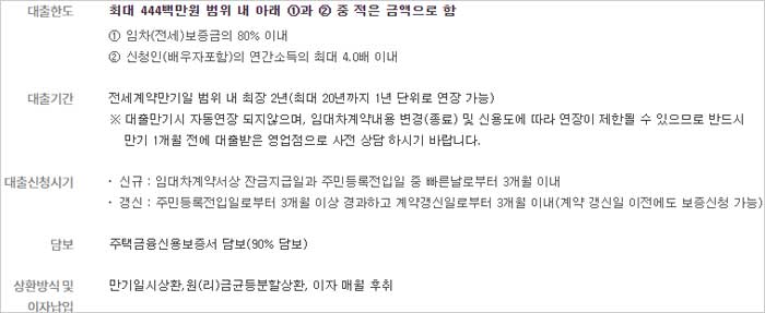 ▶ 대상 주택은 공부상(등기부등본 등) 주거용 주택(미등기 주택도 가능)이며 ▶ 대출기간은 전세계약만기일 범위 내 2년이라고 하는데요. 다만 최대 20년까지 1년 단위로 연장이 가능하다고 해요. ▶ 담보는 주택금융신용보증서 담보(90% 담보)이며 ▶ 상환방법 및 이자납입은 만기일시상환, 원(리)금균등분할상환 방식이며 이자는 매월 후취한다고 해요.