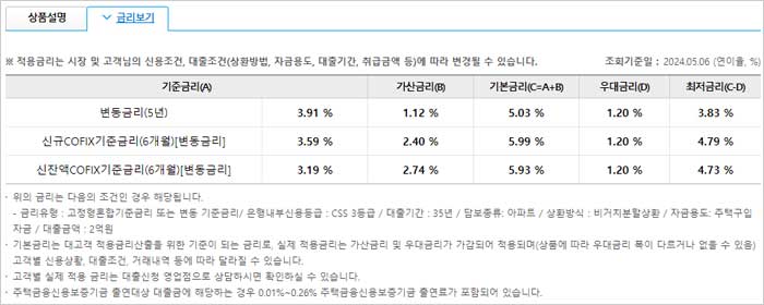 ▶ 금리 이자 이율은 다음과 같은데요. 2024년 5월 6일 기준금리 및 가산금리, 기본금리, 우대금리, 최저금리라고 해요.