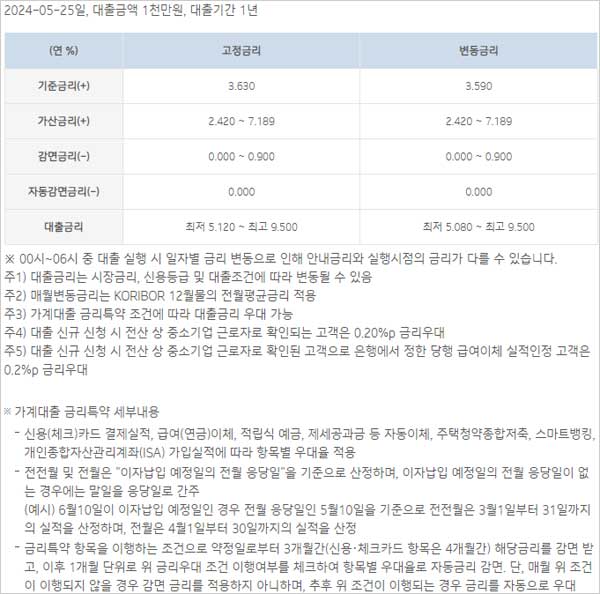 ▶기업은행 비상금대출 금리 이자 이율은 2024년 5월 25일 현재 기준 다음과 같으며 대출금액 1천만원, 대출기간 1년 기준에 대한 금리 이자 이율이라고 합니다.