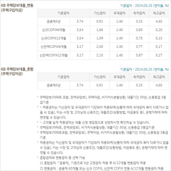 ▶국민은행 주택담보대출 금리 이자 이율은2024년 5월 25일 기준 다음과 같다고 합니다. 다만 금리관련 자세한 사항은 영업점 직원과 상담을 통해 확인이 가능하다고 합니다