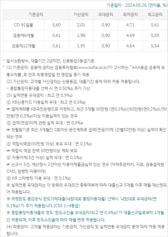 ▶ 국민은행 교직원 신용대출 금리 이자 이율은 2024년 5월 26일 현재 다음과 같다고 합니다. 일시상환방식, 대출기간 2년 미만, 신용등급 3등급 기준에 따른 금리라고 합니다.