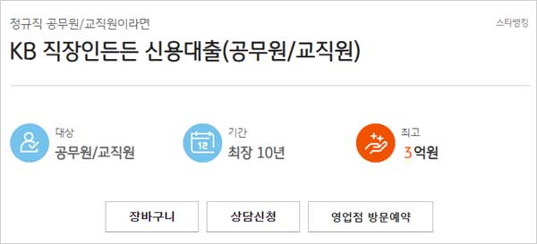 국민은행 공무원 교직원 신용대출 한도 금리 중도상환 등 보다 자세한 사항은 각 영업점 또는 KB국민은행 고객센터(1588-9999), KB국민은행 홈페이지 신용대출 카테고리 내 KB 직장인든든 신용대출(공무원/교직원) 항목을 통해 확인 할 수 있다고 합니다. 국민은행 교직원 공무원 신용대출 관련 내용 참고하셨으면 좋겠습니다.