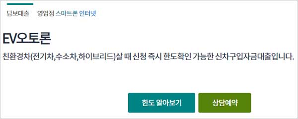 하나은행 EV오토론 담보대출 상품은 하나은행 홈페이지에서 소개하고 있으며 친환경차인 전기차,수소차,하이브리드차 를 구매할 때 신청 즉시 한도 확인이 가능한 신차구입자금 대출 상품이라고 합니다.