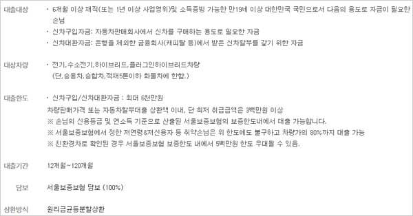 서울보증보험의 보증한도내에서 대출이 가능하며 서울보증보험에서 정한 저연령 및 저신용자 등은 위 한도에도 불구하고 차량가의 80%까지 대출이 가능하며 친환경차로 확인된 경우 서울보증보험 보증한도 내에서 5백만원 한도가 우대될 수 있다고 합니다.