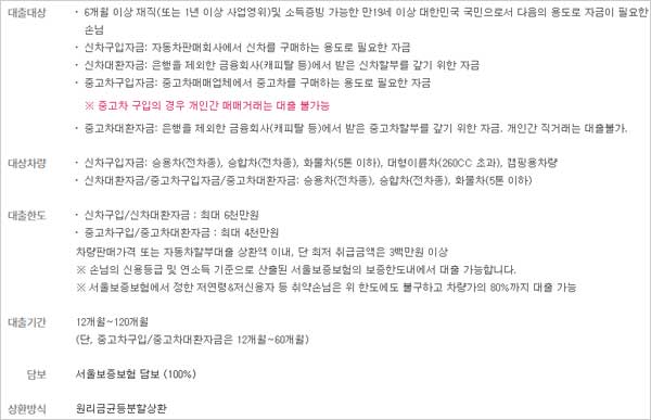 신용등급 및 연소득 기준으로 산출된 서울보증보험의 보증한도내에서 대출이 가능하며 서울보증보험에서 정한 저연령 및 저신용자 등은 위 한도에도 불구하고 차량가의 80%까지 대출이 가능하다고 합니다.