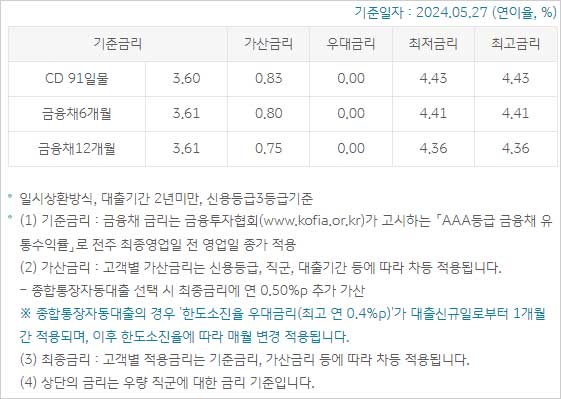 ▶ 국민은행 KB온국민 신용대출 금리 이자 이율은 다음과 같다고 합니다. 2024년 5월 27일 현재 일시상환방식, 대출기간 2년 미만, 신용등급 3등급 기준이라고 합니다.