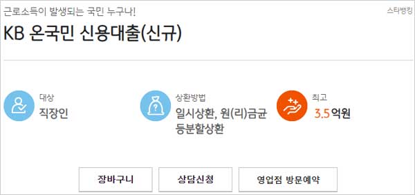 보다 자세한 사항은 각 영업점 또는 KB국민은행 고객센터(1588-9999), KB국민은행 홈페이지 신용대출 카테고리 내 KB 온국민 신용대출 항목을 통해 확인 할 수 있다고 합니다.