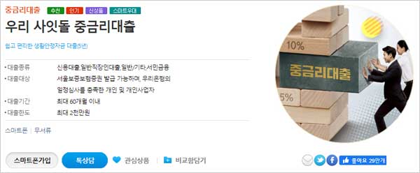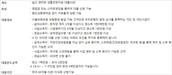 기타 자세한 내용은 영업점 직원 또는 우리은행 고객센터(1599-5000 또는 1588-5000)에 문의하시거나 우리은행 홈페이지 신용대출 카테고리 내 우리 사잇돌 중금리대출 항목 을 통해 확인 할 수 있다고 합니다.