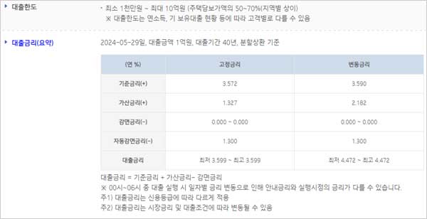 ▶ 기업은행 아파트담보대출 금리 이자 이율은 다음과 같다고 합니다. 2024년 5월 29일 현재 대출기간 40년, 대출금액 1억원, 분할상환 기준에 대한 금리라고 합니다.