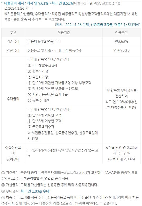 ▶ 국민은행 새희망홀씨 2 대출 금리 이자 이율은 다음과 같다고 합니다. 대출금리 예시 : 최저 연 7.61%∼최고 연 8.61%로서 대출기간 5년 이상, 신용등급 3등급, 2024.1.26일 기준이라고 합니다.
