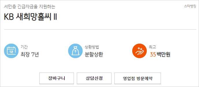 국민은행 새희망홀씨2 대출 한도 금액, 금리 이자, 신청 대상 자격조건,필요서류, 담보, 기간, 중도상환수수료 등 보다 자세한 사항은 각 영업점 또는 KB국민은행 고객센터(1588-9999), KB국민은행 홈페이지 신용대출 카테고리 내 KB 새희망홀씨2 항목을 통해 확인 할 수 있다고 합니다. 관련내용 참고하셨으면 좋겠습니다.