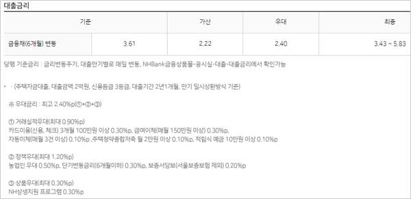 ▶ 농협 전세자금대출 금리 이자 이율은 다음과 같다고 합니다. 2024년 6월 2일 현재 주택자금대출, 대출금액 2억원, 신용듬급 3등급, 대출기간 2년1개월, 만기 일시상환방식 기준에 따른 금리라고 합니다.