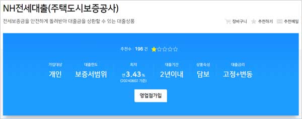 농협 전세자금대출 금리 이자, 한도 금액, 신청 대상 주택 자격조건, 담보, 서류, 중도상환수수료, 기간, 주택도시보증공사 보증 등 보다 자세한 내용은 상품설명서를 참조하거나 고객행복센터(1661-3000, 1522-3000) 또는 각 영업점, 농협은행 홈페이지 주택/전세대출 카테고리 내 NH전세대출(주택도시보증공사) 항목을 통해 확인할 수 있다고 합니다. 농협은행 전세자금대출 금리 조건 관련 내용 참고하셨으면 좋겠습니다.
