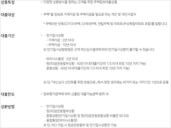 주택을 담보로 가계자금 및 주택자금을 필요로 하는 개인 및 개인사업자라고 합니다. 참고로 주택이란 단독(다가구)주택, 다세대주택, 연립주택 및 아파트(주상복합아파트 포함)를 말한다고 합니다.