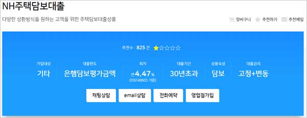 농협은행 주택담보대출 금리 이자, 마이너스 통장 한도 금액, 신청 대상 자격 조건, 담보, 중도상환수수료, 서류, 기간 등 보다 자세한 내용은 상품설명서를 참조하거나 고객행복센터(1661-3000, 1522-3000) 또는 각 영업점, 농협은행 홈페이지 주택/전세대출 카테고리 내 NH주택담보대출 항목을 통해 확인할 수 있다고 합니다. 농협은행 주택담보대출 금리 한도 조건 관련 내용 참고하셨으면 좋겠습니다.