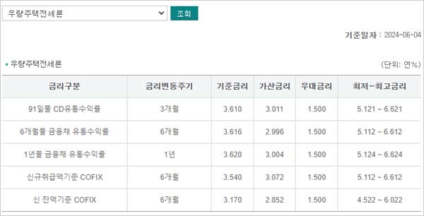 ▶ 하나은행 우량주택전세론 대출 금리 이자 이율은 다음과 같다고 합니다. 2024년 6월 4일 현재 대출기간 2년, 신규 전세자금 용도, 당행 내부 신용등급 3등급인 고객에게 적용하는 금리라고 합니다.