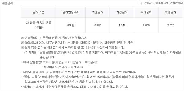 ▶ 하나은행 청년 월세 보증금 대출 금리 이자 이율은 다음과 같다고 합니다. 2021년 6월 29일 현재 내부신용(ASS) 1~13등급, 대출기간 3년이상, 대출금액 6백만원 기준에 대한 금리라고 합니다.