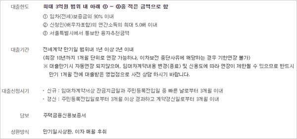 ▶ 상환방법은 만기일시상환방식이며 신규대출신청은 임대차계약서상 잔금지급일과 주민등록전입일 중 빠른 날로부터 3개월 이내이며 갱신신청은 주민등록전입일로부터 3개월 이상 경과하고 계약갱신일로부터 3개월 이내라고 합니다.