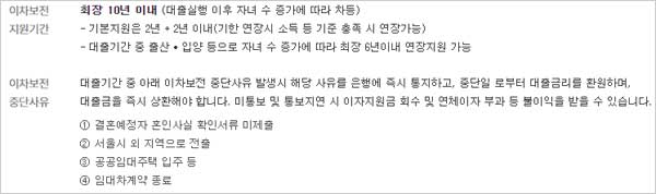 ▶ 대출 기간은 전세계약만기일 범위 내 1년 이상 2년 이내라고 하며 최장 10년까지 1개월 단위로 연장 가능하나, 이차보전 중단사유에 해당하는 경우에는 기한연장이 불가능하다고 합니다.