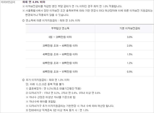 ▶ 이차보전금리는 최대 연 4.0% 이하 이며 ▶ 이차보전 지원기간은 최장 10년 이내 (대출실행 이후 자녀 수 증가에 따라 차등)라고 합니다.