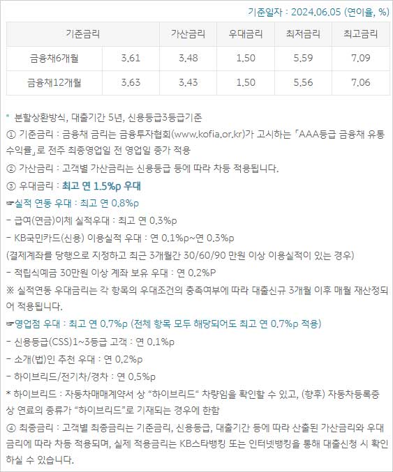 ▶ kb국민은행 자동차대출 KB매직카대출 금리 이자 이율은 다음과 같다고 합니다. 2024년 6월 5일 현재 분할상환방식, 대출기간 5년, 신용등급 3등급 기준에 대한 금리라고 합니다.