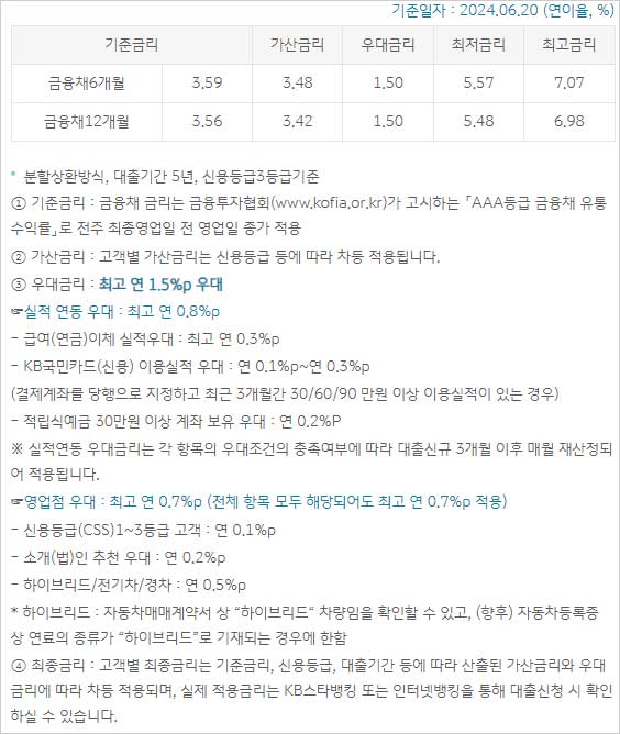 ▶ KB매직카대출 국민은행 신차대출 금리 이자 이율은 다음과 같다고 합니다. 2024년 6월 20일 현재 분할상환방식, 대출기간 5년, 신용등급 3등급 기준에 대한 금리라고 합니다.
