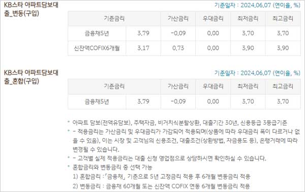 ▶ 국민은행 아파트담보대출 금리 이자 이율은 다음과 같다고 합니다. 2024년 6월 7일 현재 아파트 담보(전액유담보), 주택자금, 비거치식분할상환, 대출기간 30년, 신용등급 3등급 기준에 따른 금리라고 합니다.