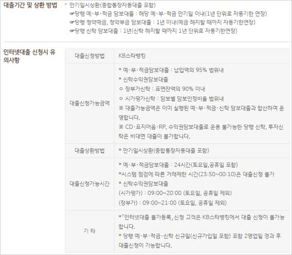 ▶ 상환방법은 만기일시상환방식(종합통장자동대출 포함)이며 ▶국민은행 예금담보대출 중도상환 수수료 해약금은 적용되지 않으며 ▶ 담보는 국민은행 예금 부금 적금 신탁 등의 담보라고 합니다.