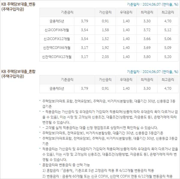 ▶ KB국민은행 주택담보대출 금리 이자 이율은 다음과 같다고 합니다. 2024년 6월 7일 현재 주택담보(아파트 포함, 전액유담보), 주택자금, 비거치식분할상환, 대출기간 30년, 신용등급 3등급 기준에 따른 금리라고 합니다.