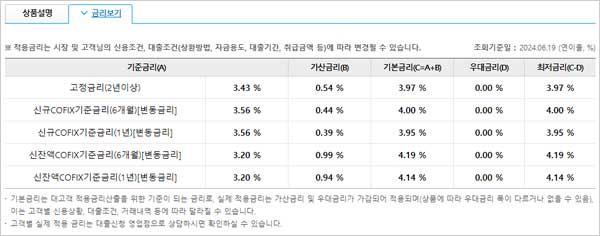 ▶ 우리은행 전세자금대출 서울보증 갈아타기 금리 이자 이율은 다음과 같다고 합니다. 2024년 6월 19일 현재 기준금리, 가산금리, 기본금리, 우대금리, 최저금리라고 합니다.
