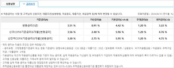 ▶ 우리은행 우리아파트론 아파트담보대출 금리 이자 이율은 다음과 같다고 합니다. 2024년 6월 19일 현재 금리유형은 고정형혼합기준금리 또는 변동 기준금리, 은행내부신용등급 CSS 3등급, 대출기간 35년, 아파트, 비거치분할상환, 주택구입자금, 대출금액 2억원에 대한 금리라고 합니다.