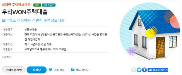 우리은행 주택담보대출 금리 이자, 한도 금액, 비대면 모바일 신청대상 주택 자격조건, 중도상환수수료, 서류, 담보, 기간 등 보다 자세한 내용은 영업점 직원 또는 우리은행 고객센터(1599-5000 또는 1588-5000)에 문의하시거나 우리은행 홈페이지 부동산 담보대출 카테고리 내 우리WON주택대출 항목을 통해 확인 할 수 있다고 합니다. 우리은행 주택담보대출 금리, 한도, 서류, 조건 관련 내용 참고하셨으면 좋겠습니다.