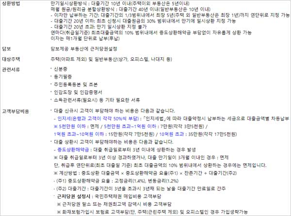 ▶ 상환방법은 만기일시상환방식 경우에는 대출기간 10년 이내(주택이외 부동산은 5년이내)이며 매월 원금/원리금 분할상환방식은 대출기간 40년 이내(일반부동산은 10년 이내)라고 합니다. 다만 대출기간 20년 이하라면 최초 신청시 대출원금의 30% 범위내에서 만기에 일시상환 지정이 가능하지만 대출기간이 20년을 초과하면 만기 일시상환 지정은 불가능 하다고 합니다
